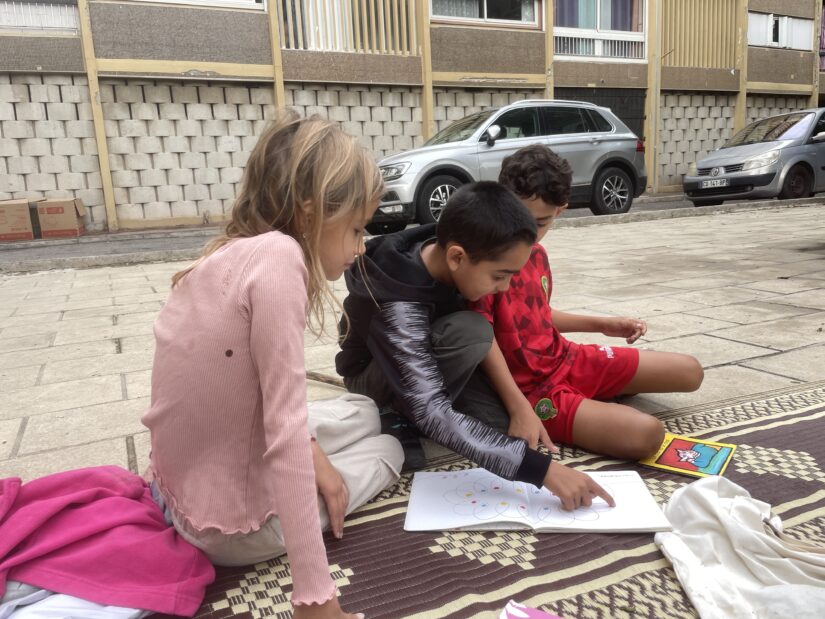 Le mouvement a d’abord testé Maurelette 1. « Mais les parents ne laissaient pas sortir leurs enfants à cause des jeunes qui faisaient des roues arrière à moto, alors on a migré à La Maurelette 2 ». L’avantage de la 2 ? La large cour encerclée de quatre barres d’immeubles. Les habitants ont vue sur tout ce qui se passe. C’est un des ingrédients de la Bibliothèque de rue. Pour accrocher le plus d’enfants, l’animation – gratuite – doit se dérouler sous le regard des familles. Elles peuvent ainsi les surveiller et assister à leur appétit de lire.