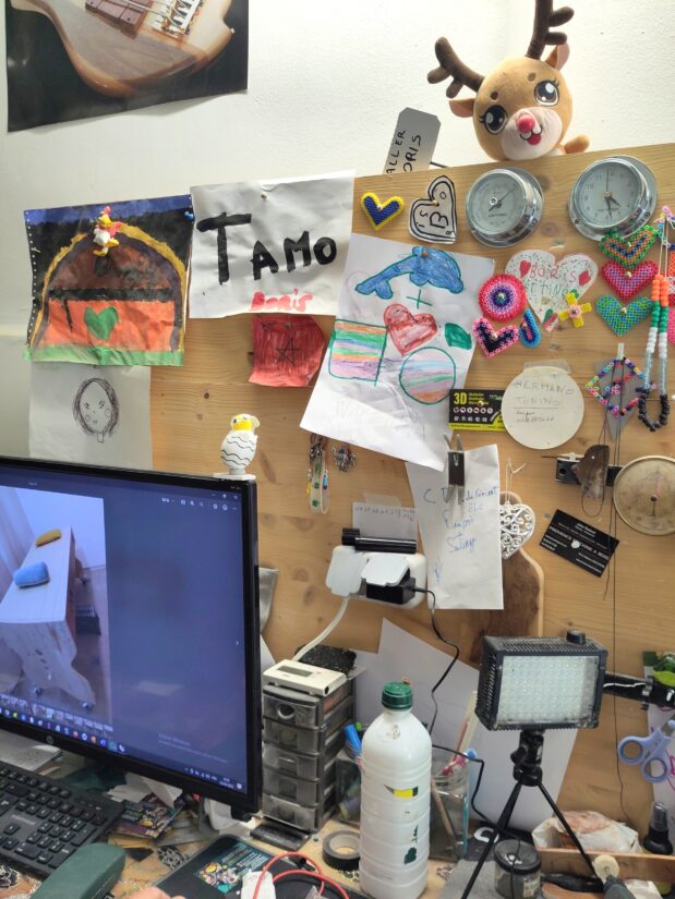 Pour trouver le luthier, il faut s’avancer un peu dans l’atelier. Entre les murs tapissés de dessins d’enfants et les établis en désordre.