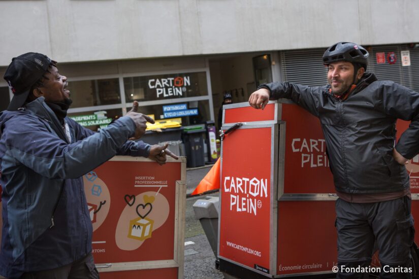 Depuis une dizaine d’années, l’association Carton Plein soutient en région parisienne des personnes exclues du marché de l’emploi, tant des sans-abri que des personnes au statut de réfugié. Chaque jour, au sein de différents ateliers, les salariés réemploient et vendent des cartons de seconde main, reprenant ainsi confiance en eux.