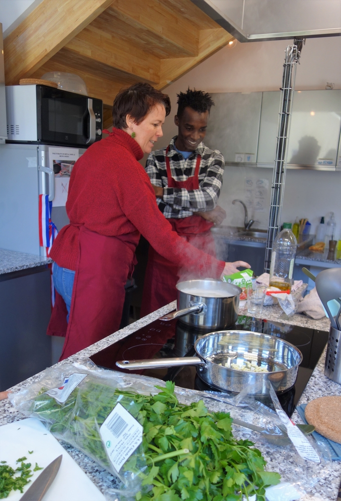 Parmi toutes les personnes fréquentant la Cuisine du 101, certaines sont novices en cuisine. À l’image d’Alagie. Originaire de Gambie, il est à Marseille depuis trois mois et vit actuellement dans un centre d’hébergement et de réinsertion sociale. Il ne vient pas seul d’ordinaire, mais avec un petit groupe de réfugiés. Unique présent ce mardi de janvier, le voilà donc réquisitionné pour confectionner le repas, épaulé par Marika et Benjamin. Suivant leurs conseils, il concocte un plat simple, mais qui saura combler les estomacs : riz et thon à la sauce tomate. « Lorsqu’ils sont plusieurs, il y en a toujours qui prennent les rênes. Les autres font les commis ou regardent. Au départ, ils font ce qu’ils savent faire, bien souvent les recettes de leurs pays. Puis petit à petit, ils s’ouvrent aux autres types de cuisines », observe Marika.