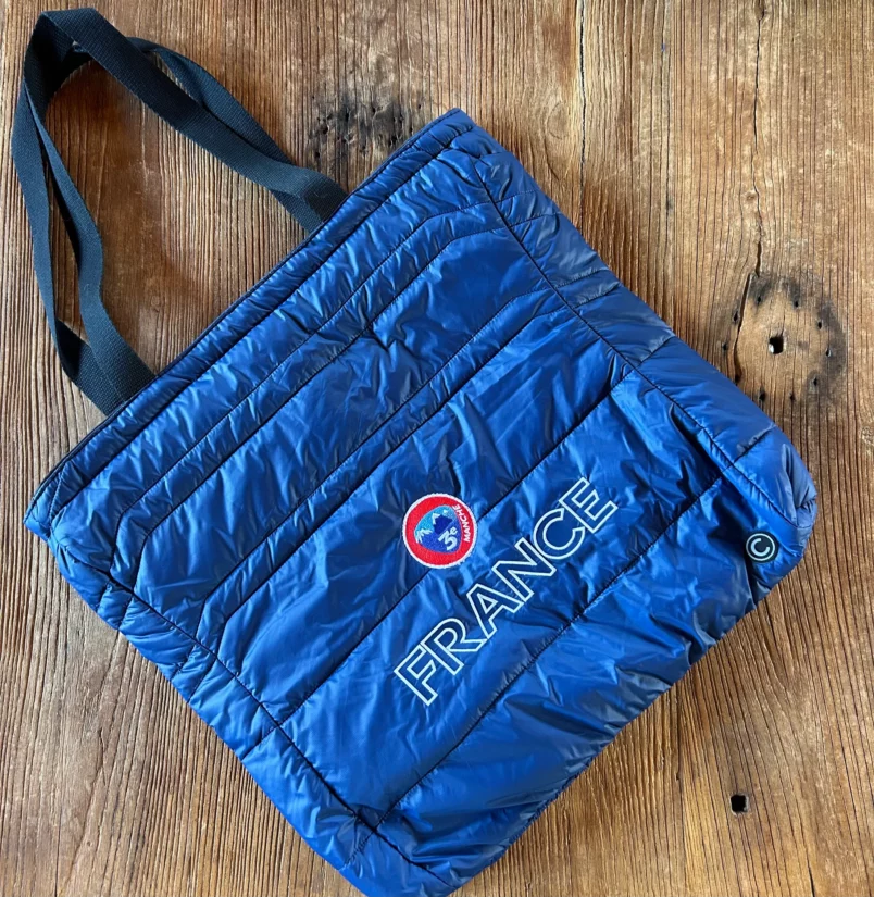 Depuis son petit atelier d’Albiez-Montrond, au cœur de la vallée de la Maurienne, elle collecte, coud et fait revivre les tenues usées des clubs, des écoles, des moniteurs… et même de l’Équipe de France de ski alpin. « Ce sont des habits faits pour résister à la neige, au vent, à l’usure. C’est du polyester traité pour être imperméable. Autrement dit : pour faire une banane, un porte-gourde ou un sac qui tiennent, on ne peut pas rêver mieux comme matière. »