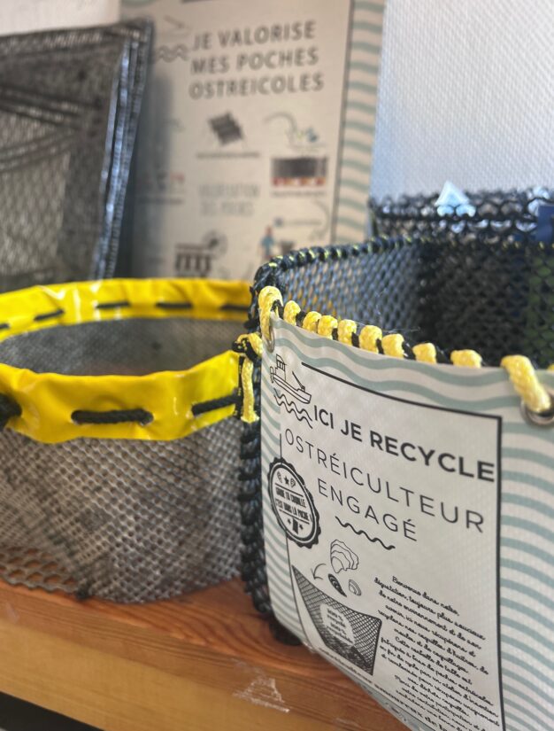 # Sacs en voiles et poches d’huîtres. Echo-Mer pratique par ailleurs l’upcycling. À savoir des activités de revalorisation textile et plastique à partir de matériaux issus du monde maritime : voiles, cordages, poches ostréicoles, combinaisons néoprène. Chaque année, plus d’une centaine de tonnes de poches à huîtres sont ainsi récupérées et transformées notamment en poubelles à bouchons.