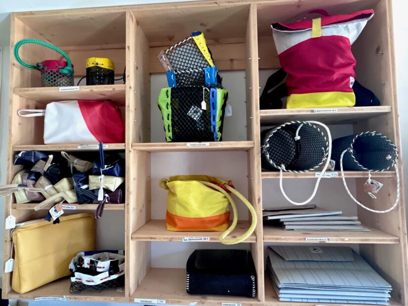 Le néoprène peut aussi servir de garniture de coussins. Ou être recyclés dans la fabrication de tapis de souris, porte-clés, lunettes. Les autres matériaux (environ 700 kg en 2024) deviennent sacs, paniers, trousses, objets de décoration divers. Ils sont fabriqués par des personnes fragilisées (personnes en situation de handicap de l’ADEI 17, détenus de la prison de Mont-de-Marsan…). Puis vendus au local de l’association, quai Georges Simenon, lieu de passage très fréquenté juste derrière l’office de tourisme de La Rochelle.