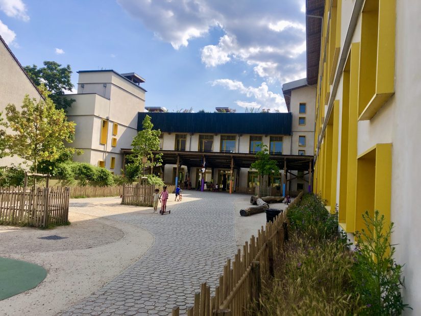 - Bassin de récupération d’eau de pluie. Le bassin de l’école Simone Veil permet de recueillir les eaux pluviales directes. Et celles qui coulent de la cour des maternelles. Cette cour possède en effet un revêtement perméable formé de pavés en bois – « du robinier, essence française la plus résistante », explique Vincent. Seule une petite partie est imperméable autour du toboggan – « car, hélas, plus facile pour faire rouler les tricycles ». La construction de l’école comporte également une cuve de récupération d’eau de pluie de 30 m3 qui sert à arroser les espaces verts. L’école a par ailleurs la particularité d’avoir des toilettes sèches extérieures. Les enfants n’ont aucune peine à les utiliser. « Les adultes, un peu moins », sourit Vincent.