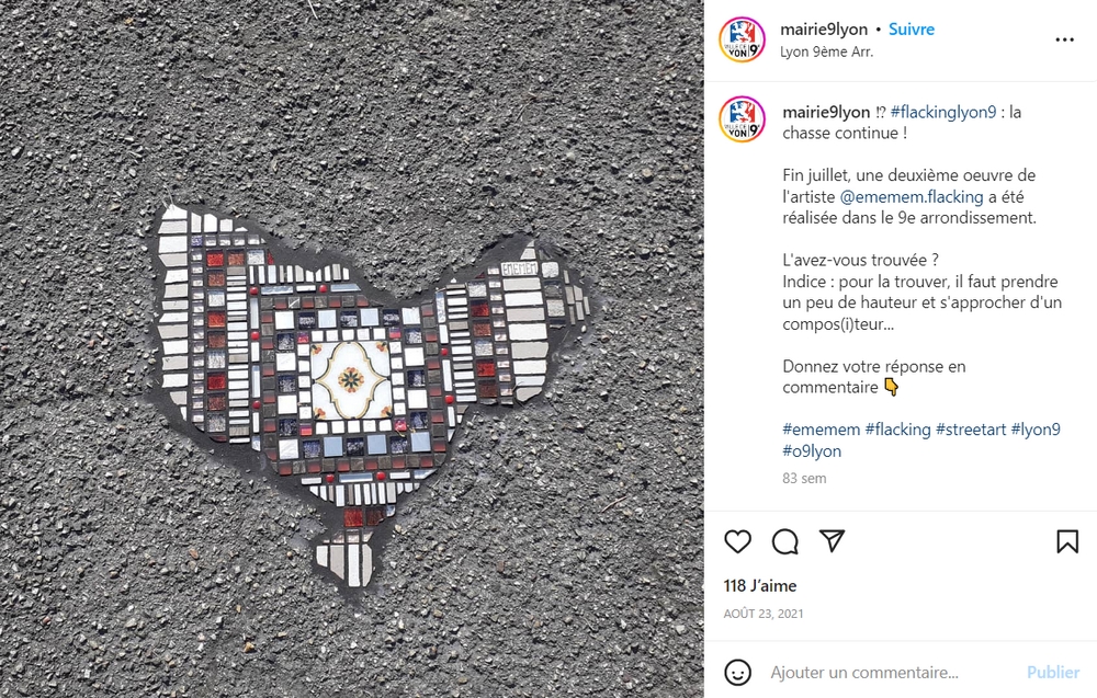 La mairie du 9e arrondissement de Lyon a commandé cinq oeuvres à Ememem dans le cadre d’un jeu de piste incitant les habitants à les rechercher © DR