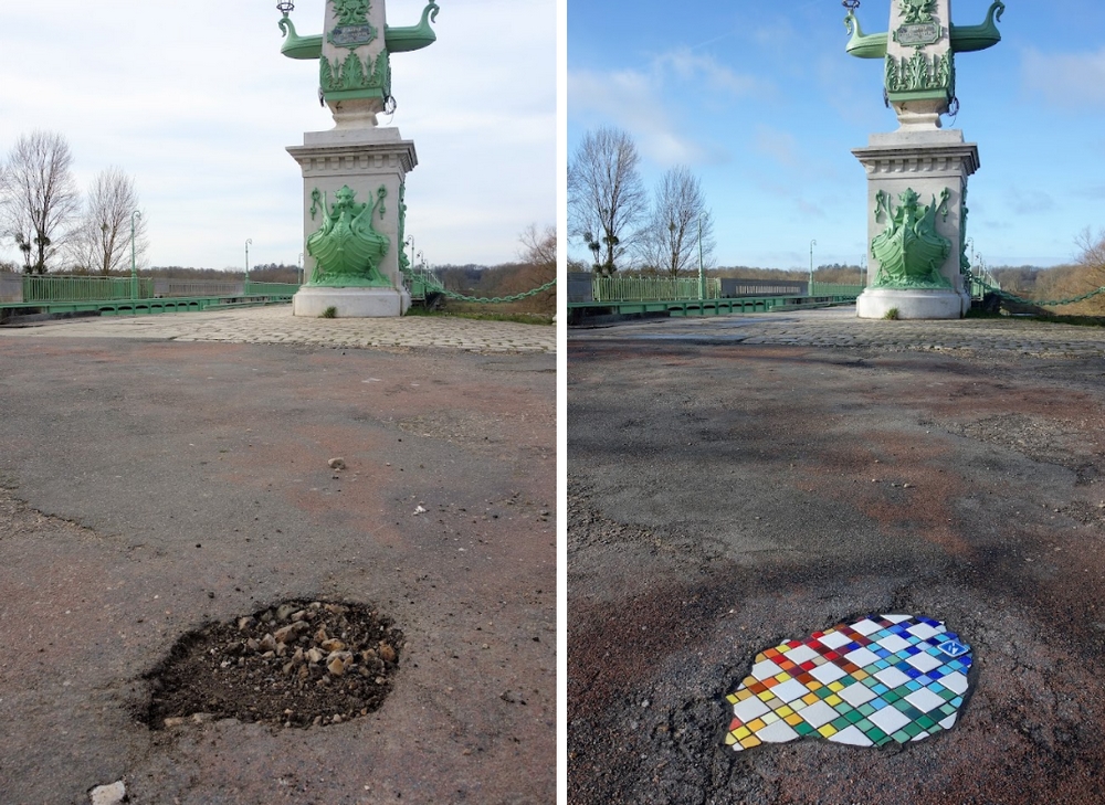 Un nid-de-poule réparé et embelli par Ememem © DR