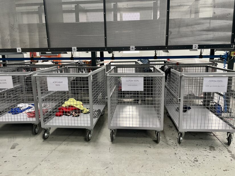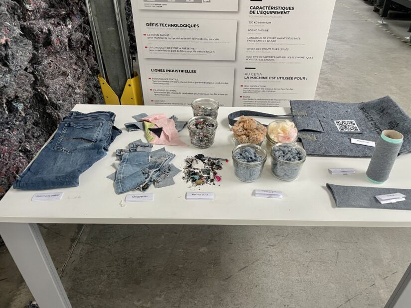 Le tri est la clé du recyclage. « On peut développer les meilleures technologies, s’il n’y pas de tri en amont, ça ne marche pas, prévient-elle. Mieux on oriente, plus on gagne en productivité. C’est notre feuille de route ». Dans le premier espace, une grande halle, CETIA a installé la machine belge Fibersort (bonus) pour trier le textile par composition (coton, polycoton, polymère, etc.) et par couleur. Cette machine peut traiter une pièce par seconde. Une fois trié, il s’agit d’enlever chaque ”point dur” des vêtements complexes, sans abîmer les fibres. À savoir tous les perturbateurs au recyclage : doublure, bouton, fermeture éclair, étiquette, etc. À cette fin, le bureau d’étude a fait une preuve de concept sur une machine de découpe laser pour venir découper autour des boutons.