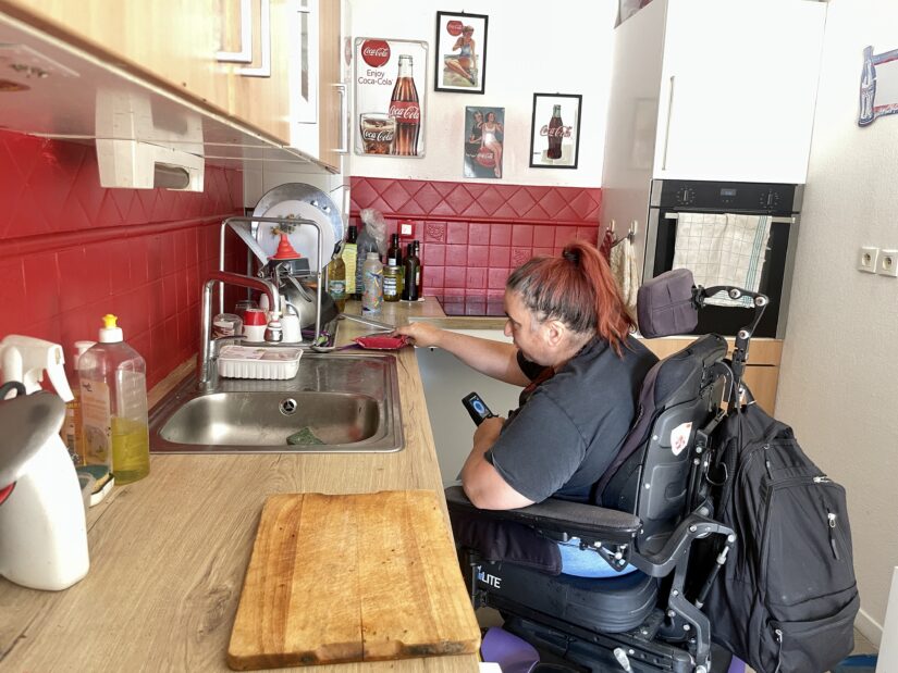Dans cet habitat, dit ”inclusif”, tout est aménagé pour les personnes en fauteuil roulant. La porte d’entrée est automatique, les ouvertures sont larges, les pièces grandes et les terrasses accessibles (pas de rebord). La douche est au sol, les interrupteurs sont à 90 cm de hauteur. Le fauteuil roulant se glisse sous les plaques de cuisson et l’évier. Et la porte du four coulisse à l’intérieur. Les seuls aménagements apportés par le couple sont des carreaux antidérapants dans la douche pour Céline, qui parvient à effectuer parfois ses transferts sur ses jambes. Et un plan de travail à hauteur de fauteuil dans la kitchenette. « Car j’avais envie de me mettre à la cuisine », souligne cette cliente des marchés de la Belle de Mai et du Vieux-Port. Ainsi, pour le déjeuner, elle a concocté un taboulé avec son auxiliaire de vie.