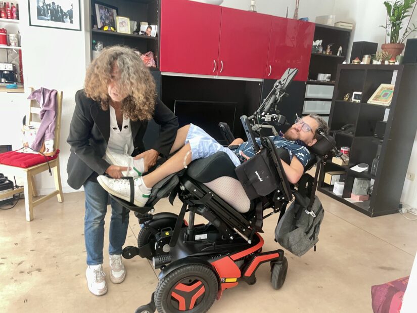 Tous les jours, comme toute personne en situation de handicap physique, Céline et Yoni bénéficient d’assistants de 6 à 13 heures et de 18 à 20 heures pour des interventions programmées – toilette, repas, etc. Mais que se passe-t-il en dehors de ses horaires si Céline fait tomber ses clés ou a besoin d’aller aux toilettes ? C’est là qu’intervient le deuxième pilier de la formule HandiToit : une aide humaine disponible toute la journée ou la nuit, à n’importe quel moment et pour n’importe quel besoin imprévisible. Boire quand on a soif, mettre un pull dès qu’on a froid, prendre un cachet quand on a mal à la tête. « C’est tout l’intérêt et même le principal d’HandiToit. Si on veut sortir dîner avec des amis et rentrer à trois heures du matin, c’est possible : une des deux permanentes viendra nous aider à nous coucher. On peut choisir notre rythme de vie », insiste Yoni.