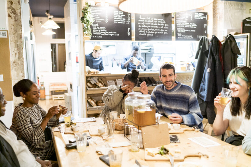 En revanche, les kawaas ont tous en commun de rassembler café, co-bureaux et ateliers, d’être ouverts au public « et à tous les publics », précise Alexis Motte. De déployer des codes ‘’comme à la maison’’ aussi bien dans la déco que dans la posture de l’équipe. « Tout est fait pour les mélanger les hôtes avec les convives : cuisine ouverte, absence d’uniforme, etc ». Enfin, de mener le même mode d’action : faire tomber les cloisons pour créer du lien. Et libre à chacun de s’emparer des cartes de conversation, qui traînent sur les tables pour discuter avec son voisin. Ou de s’asseoir à la table commune. « On ne veut rien imposer ».