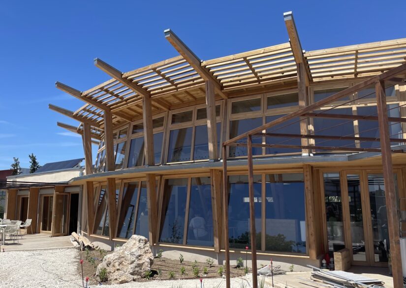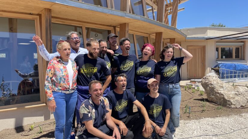 - De la vision idyllique à la réalisation. Le bâtiment du présage est bioclimatique (bois, béton de chanvre, orientation plein sud…). Il bénéficie d’une chaudière à granulés pour l’hiver. Et, sur son toit, de trois panneaux photovoltaïques (électricité) et de quatre panneaux biénergies (électricité et eau chaude). Pierre-André Aubert et ses associés ont dû cependant faire quelques compromis. « C’est tout l’enjeu entrepreneurial ». Par exemple, une partie du mur est « de l’agglo et non du bois ». Ils travaillent à améliorer le projet, notamment à transformer les déchets organiques en biogaz. Et à traiter les eaux usées pour arroser ses plantes.
