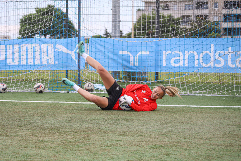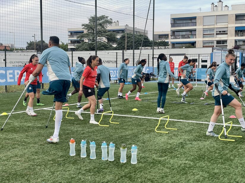 Sauter, slalomer, réaliser des passes, buter à une jambe n’est pas si facile pour les joueuses pro de l’OM. Ça rit beaucoup, ça s’encourage. « Allez, une jambe, on accélère, on va chercher vers l’avant », s’époumone l’entraîneur