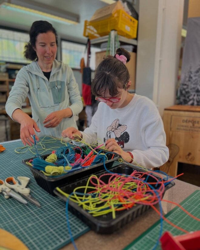 Redeem Equipment, c’est aussi du social et du solidaire avec, chaque mercredi, des jeunes de l’Institut médico-éducatif (IME) de Passy ou de l’Esat du Mont Joly de Sallanches qui viennent prêter main-forte et apprendre. Ils démêlent les cordes, font des nœuds, participent à la fabrication. « On leur fait faire des tâches simples, directes. Ils découpent par exemple les chutes de tissu qui servent de rembourrage pour nos coussins. »