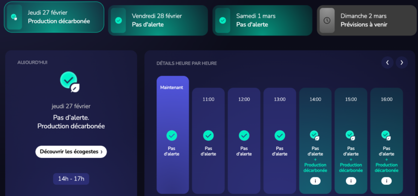 # Ecowatt, la météo de l’électricité. Porté par RTE et l’ADEME, ce dispositif citoyen permet de consommer l’électricité au bon moment et ainsi de réduire les risques de coupure d’électricité en France. Véritable météo de l’électricité, EcoWatt qualifie en temps réel le niveau d’électricité disponible pour alimenter les consommateurs français. Des signaux clairs guident les consommateurs pour adopter les bons gestes afin de limiter la consommation nationale d’électricité. Un dispositif d’alerte indique les périodes où il faudrait réduire ou décaler leur consommation d’électricité pour éviter les coupures.