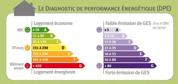 # Le diagnostic de performance énergétique. Le DPE renseigne sur la performance énergétique et climatique d’un logement ou d’un bâtiment (étiquettes A à G), en évaluant sa consommation d’énergie et son impact en termes d’émissions de gaz à effet de serre. Il s’inscrit dans le cadre de la politique énergétique définie au niveau européen afin de réduire la consommation d’énergie des bâtiments et de limiter les émissions de gaz à effet de serre et sert notamment à identifier les passoires énergétiques (étiquettes F et G du DPE, c’est-à-dire les logements qui consomment le plus d’énergie et/ou émettent le plus de gaz à effet de serre). Enfin, il informe l’acquéreur ou le locataire de la “valeur verte”, donne des recommandations de travaux à réaliser pour l’améliorer, et des estimations de ses charges énergétiques.