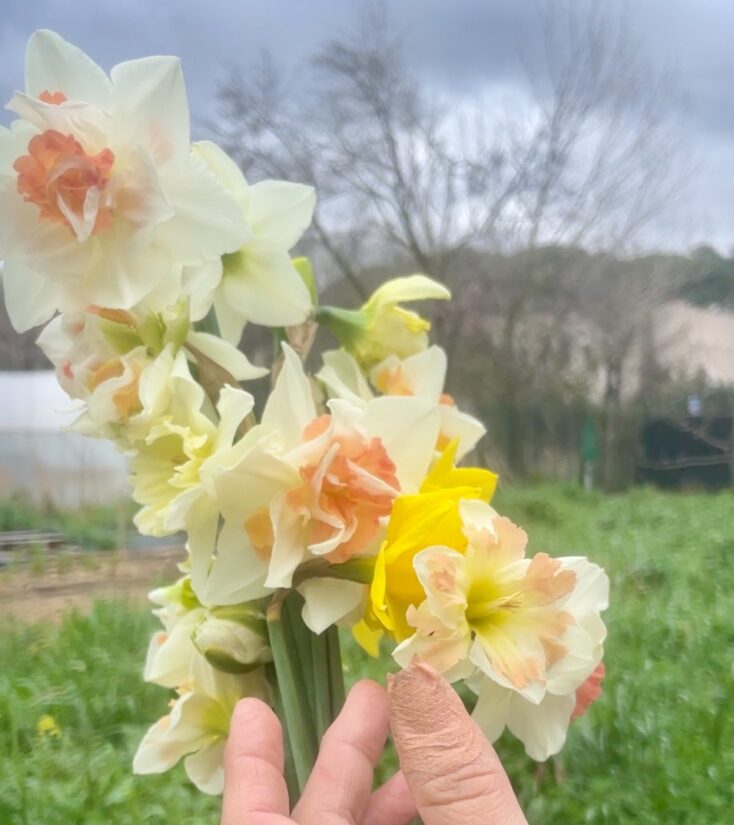 Grâce à son « bordel organisé », cette entrepreneuse engagée a moins besoin de travailler et d’arroser son sol que dans l’agriculture conventionnelle. Le maraîchage sur sol vivant lui permet également de produire efficacement sur une parcelle de 1500 m2. « Ça ne se voit pas, mais 7000 bulbes de narcisses sont plantés. C’est énorme ». Entre ses variétés annuelles et les vivaces, qui peuvent fleurir plusieurs fois par an, elle parvient à produire des fleurs entre mars et novembre. Elle les cueille à la main et livre directement aux deux fleuristes de Marseille spécialisés dans la fleur responsable, donc française (bonus).